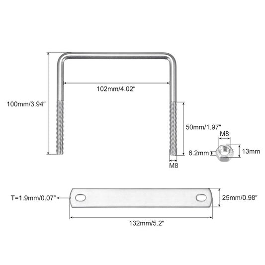 Square U-Bolts M8 304 Stainless Steel 102mm Width 100mm Length Nuts Plates 2Pc