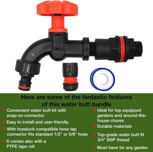 Water Butts Kit 3/4'' Bsp Tap Standard Click Lock Hose Connector PTFE Tape Roll
