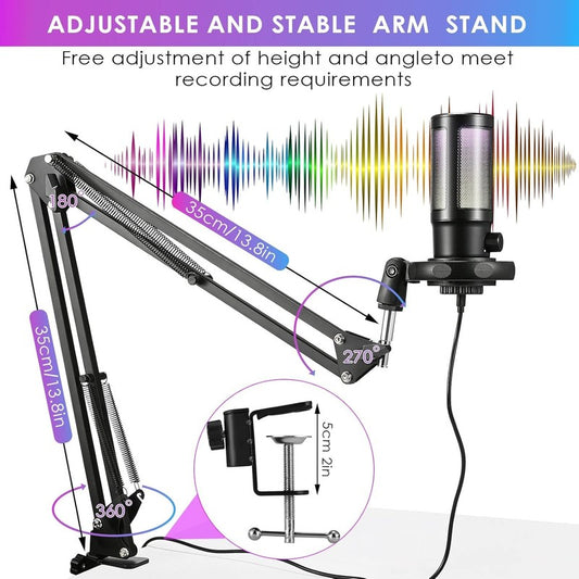 USB Gaming Microphone PC Cardioid Condenser Mic Kit RGB Boom Arm Mute Streaming