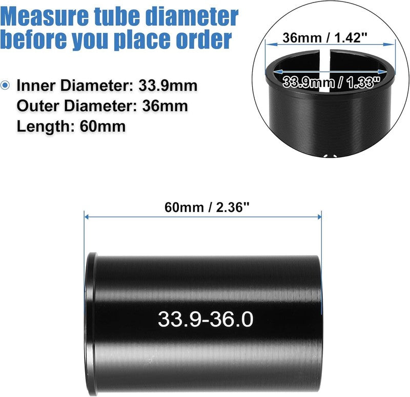 - Size: 33.9mm to 36mm. Inner Diameter: 33.9mm / 1.33", Outer Diameter: 36mm / 1.42", Length: 60mm / 2.36"