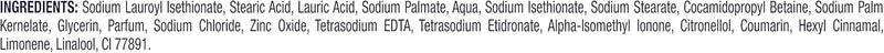 Sodium Lauroyl Isethionate Stearic Acid Sodium Palmitate Lauric Acid Aqua Sodium Isethionate Sodium Stearate Cocamidopropyl Betaine Sodium Palm Kernelate Glycerin Parfum Sodium Chloride Zinc Oxide Tetrasodium EDTA Tetrasodium Etidronate Alumina Alpha-Isomethyl Ionone Benzyl Alcohol Citronellol Coumarin Hexyl Cinnamal Limonene Linalool CI 77891