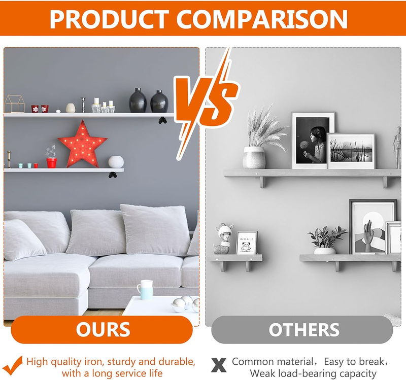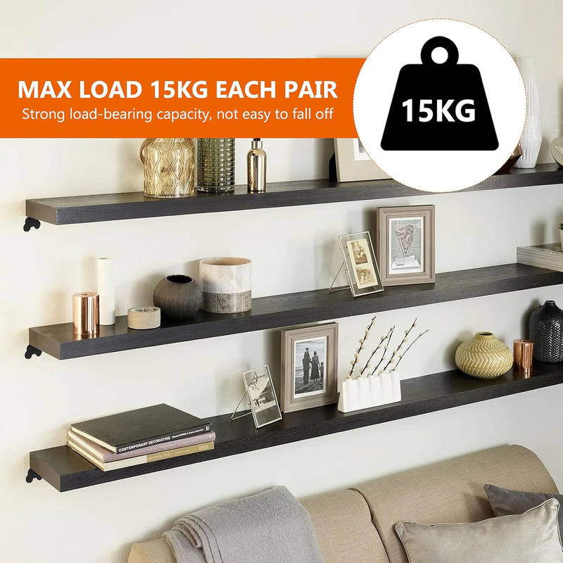 These floating shelf brackets are crafted from high quality solid steel with smooth edges and no burrs, ensuring safety, strength, and resistance to deformation. The corrosion resistant black finish helps prevent rust and wear over time. Once installed, the brackets remain hidden beneath the shelf, creating a floating shelf look that enhances any interior décor.