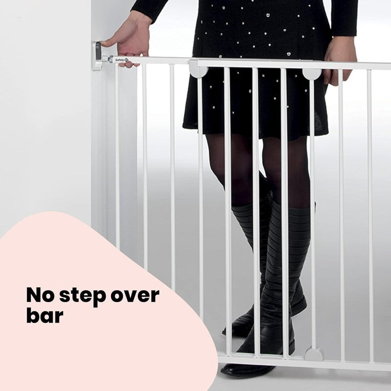 This screw fit baby gate features extendable panels for quick and straightforward installation. The integrated wall hook release mechanism allows the gate to be easily removed when not in use, without compromising the strength of the installation. With no bottom step over bar, this gate significantly reduces tripping hazards, making it particularly suitable for use at the top or bottom of stairs.